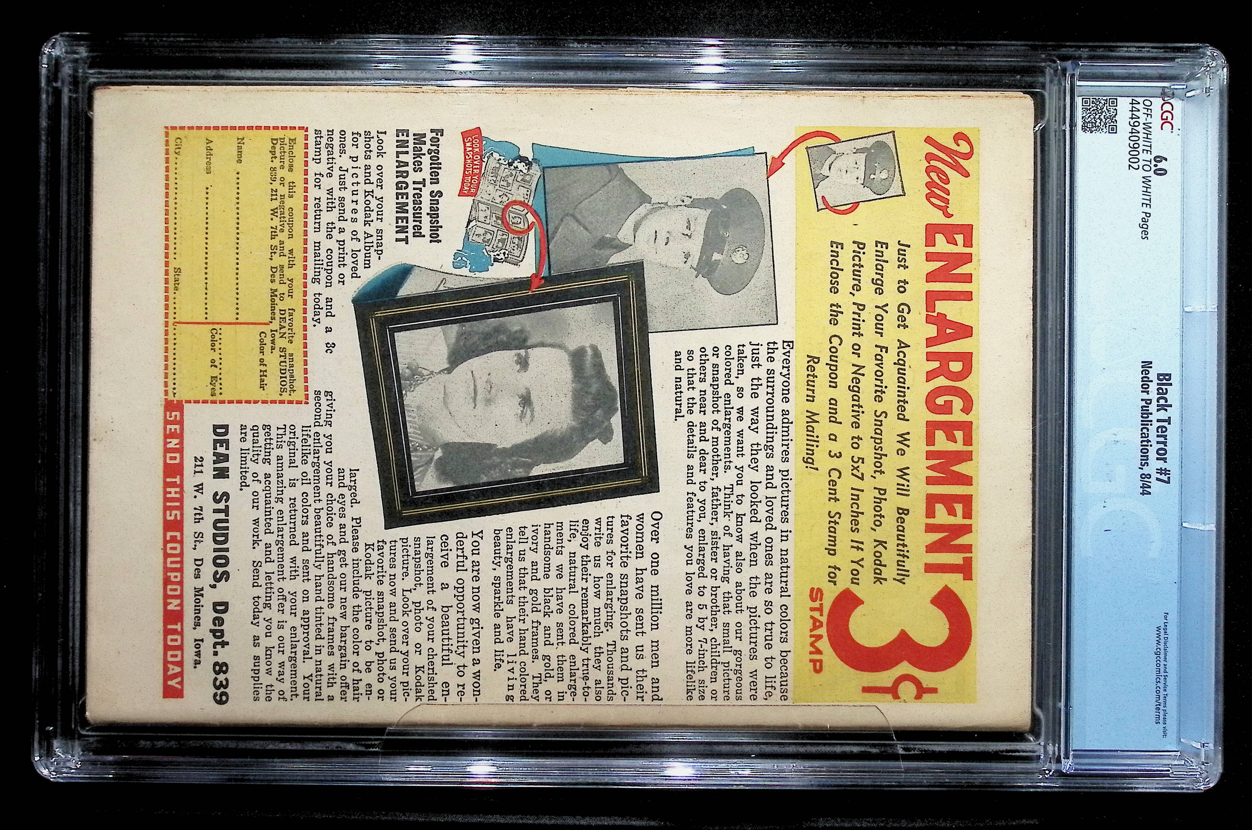 The collectible value of an original 1944 copy of Black Terror #7 varies significantly based on its professional grade and condition. Due to its status as a Golden Age comic, it is highly valuable to collectors.