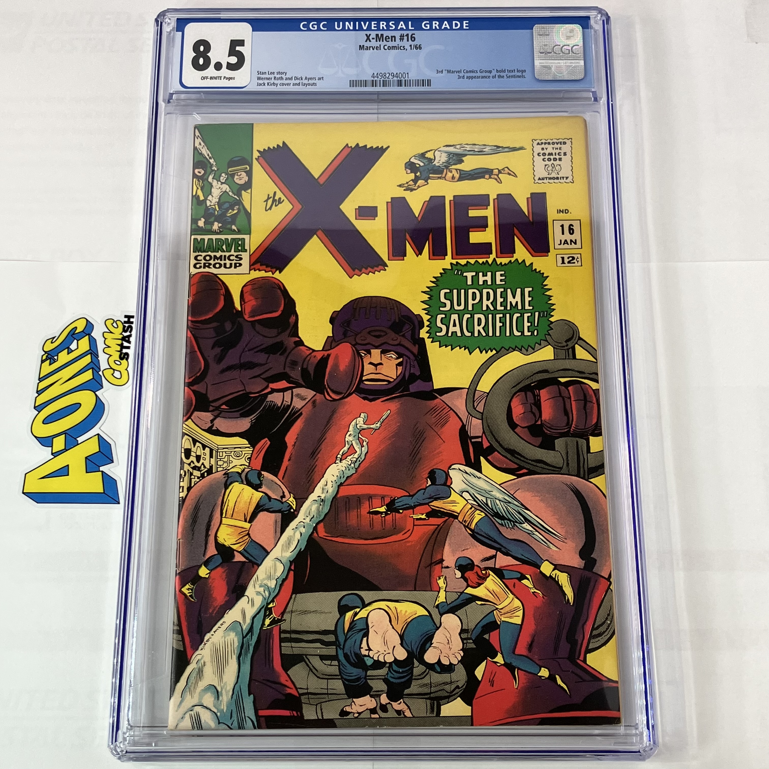 CGC graded copy of X-men issue #16, featuring the third appearance of the Sentinels and full appearance of Master Mold. CGC graded at 8.5 with Off-White page quality.